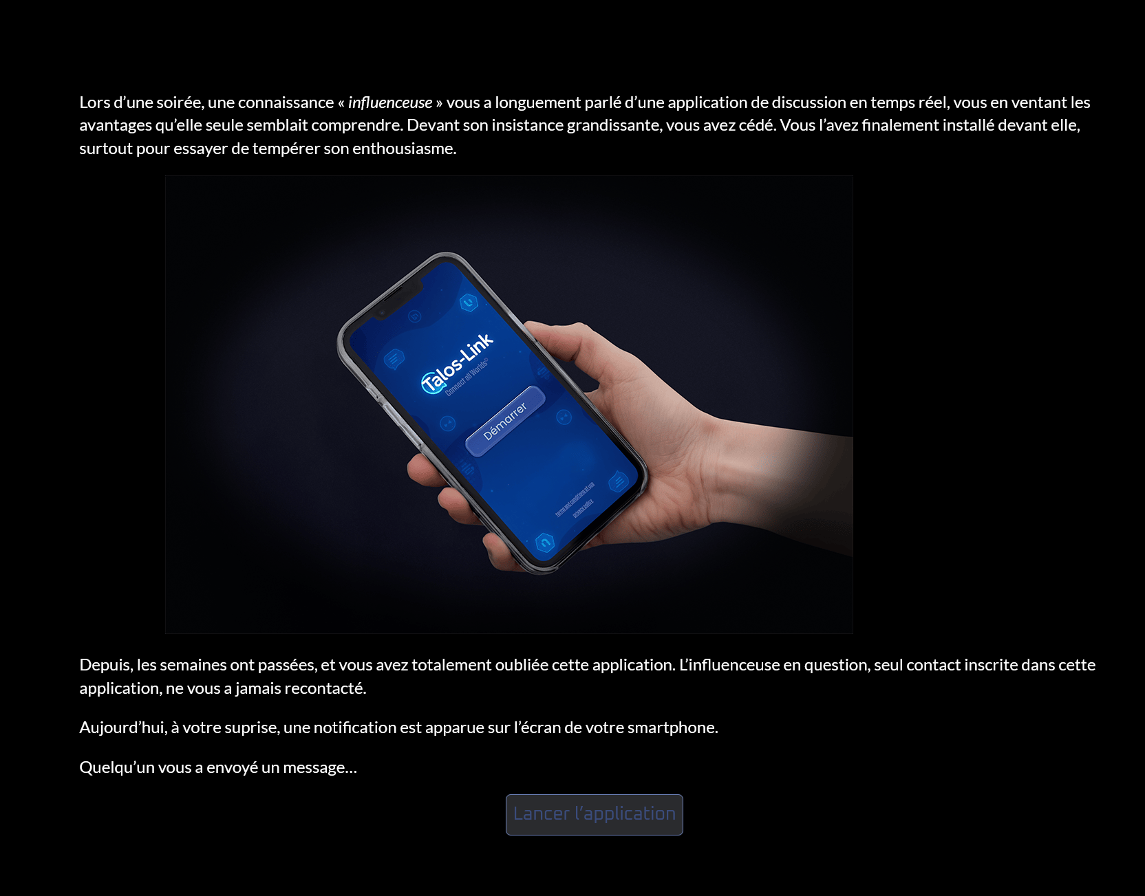 Le Grimoire d’entre les Mondes vous place entre les mains une application de conversation au travers de laquelle un inconnu vous contacte pour vous demander votre aide.